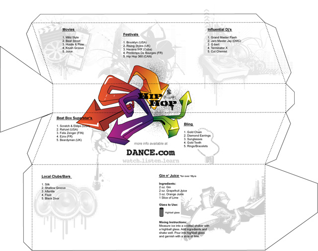 When opening the package, I wanted to give the purchaser a small taste as to the culture of the dance that they were buying into. In this case you have ‘5’ examples of Movies, Festivals, Dj’s and even jewellery related to Hip Hop. If dance can be considered an attitude, I figured it’s best to start getting into the culture in various ways. There’s even a recipe for Snoop Dog’s preferred alcoholic cocktail ‘Gin & Juice’